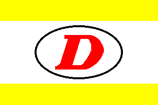 White flag with two narow stripes in top and bottom and a red D inscribed in a black oval in the middle.