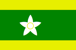 Three horizontal stripes of yellow, green and yellow in the proportions 1:3:1 with a white orange flower which is offset from the center towards the hoist. Yellow stands for happiness, green for peace and white for simplicity and purity. Adopted 1952-05-05.