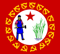Reference is made in this book to the proclamation of a Communist Republic in North Korea and a flag of most unusual--if doubtfully authentic--design is illustrated. The field is square and red; it bears a white disc in the center surrounded by seventeen crossed yellow hammers and sickles. Within the disc is a worker dressed in blue cap, overalls, and apron, plus a pink shirt; he is holding a hammer. To his left are green plants, presumably intended to be rice, growing from water. Between these two emblems (symbolic of industry and agriculture) is a red star.