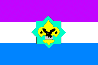 Flag of Scouts` Movement Organization of Kazakhstan. An eagle and blue colour are from national flag of Kazakhstan; violet, white colours and fleur-de-lis are from symbolics of international scouts` movement