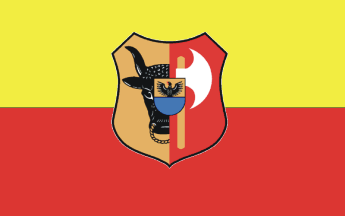 Leszno: horizontal yellow-red with the coat of arms in the middle.