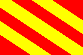 Seven red and yellow descending stripes, parallel to a central diagonal.