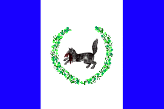1. Flag is a rectangular with 3 vertical stripes, two ones are blue and middle one is white. In the center of the last — the main part of coat of arms is - black babr running to the left side and holding of red [as in the description!] sable in its mouth. The babr is surrounded with stilized branches of cedar. [the image has a mistake - the wreath is ommitted]. Proportions: 2:3. The width of middle stripe is 1/2 of flag's length. The flags colours are simbolising: