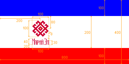 - The state flag of the Republic of Mariy-El is made of a rectangular field with three horizontal stripes: the upper stripe is azure blue and its width is 1/4 of the flag width, the middle stripe is white and its width is 1/2 of the flag width, the lower stripe is red and its width is 1/4 of the flag width. The length of the flag is related to its width by a ratio of 2:1. In the left half of the white stripe, near to the flag hoist, is represented a fragment of a Mari national ornament. It is inscribed in a square, whose side equals 1/4 of the flag width. Below is the writing MARIY EL. The emblem and the inscription are reddish brown. The distance between the geometrical center of the ornament and the hoist is 1/2 of the flag width. The distance between the geometrical center of the ornament and the lower edge of the blue stripe is 1/5 of the flag width. The thickness of the lines of the ornament is 1/50 of the flag width. The writing MARIY EL is inscribed in a rectangle, whose sides equal 1/4 and 1/10 of the flag width. The rectangle is placed below the ornament 1/20 of the flag width from the upper edge of the red stripe. The height of the small capital letters is 3/4 the height of the normal capital letters. The lines constituting the letters have a thickness of 1/10 of the height of the small capitals. [See construction sheet bellow — ed.]