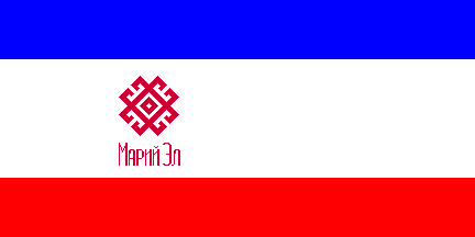 According the Resolution relative to the flag and the coat of arms of the Republic of Marii-El of the 3rd of September 1992, the flag has three horizontal stripes (1:2:1), the first is blue, the second is white and the third is red. On the white stripe, at a distance to the hoist equal to the width of this white stripe, there is a local ornament (a stylised sun) and under, the name of the Republic in cyrillic letters: