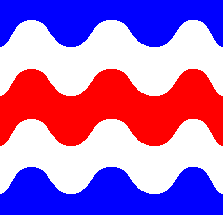 Blazoned in English: "Four times parted per fess wavy, Azure, Argent, Gules, Argent and Azure."