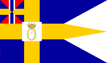The first yacht flag of the KSSS consisted of Swedish war ensign, swallow tailed and with the red and white union canton, defaced with the cypher of Crown Prince Oscar (later king Oscar I) on a white panel set over the intersection of the arms of the cross. The cypher consisted of the letter O and a crown princely crown.