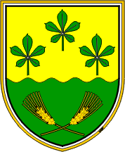 Per fess wavy or three chestnut leaves vert and of the last two wheat ears in saltire embowed of the first.