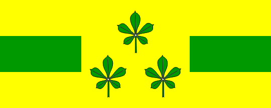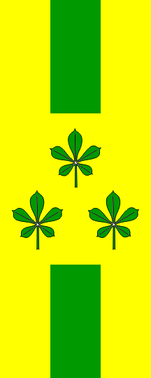 The flag is rectangular in ratio 2:5, horizontally divided yellow-green-yellow, with the green central stripe broken off in the middle to form a square yellow field containing the three green chestnut leaves fromp the coat of arms.
