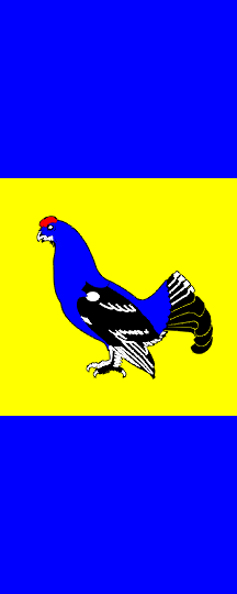 The flag is rectangular in ratio 2:5, vertically divided in three fields, the first and third are (cobalt) blue and the middle one is square of yellow colour. It contains the bird from the coat of arms, prescribed to be not not lower then 70% of the hoist and not higher the 90%.