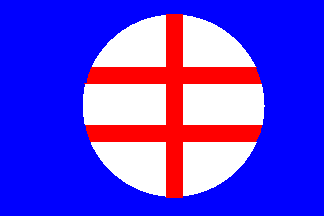 as a red flag with a blue "double cross" in a white cirle (the arms of