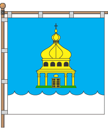 the sides: 1:1. In a blue field is the yellow monastery gate on