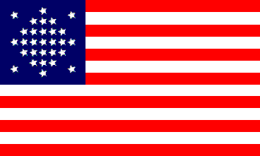 Diamond Pattern 29 Star - As depicted in the postage stamp, it consists of 13 stripes, blue canton with 29 5-pointed stars arranged in a diamond pattern.