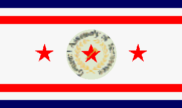 In the center of the red field shall be a smaller circular field of blue, separated from the surrounding red field by a circular margin or stripe of white of uniform width and of the same width as the straight margin or stripe first mentioned. The breadth or diameter of the circular blue field, exclusive of the white margin, shall be equal to one-half of the width of the flag. Inside the circular blue field shall be three five-pointed stars of white distributed at equal intervals around a point in the center of the blue field and shall be of such size and arrangement that one point of each star shall approach as closely as practicable without actually touching one point of each of the other two around the center point of the field; and the two outer points of each star shall approach as nearly as practicable without actually touching the periphery of the blue field. The arrangement of the three stars shall be such that the centers of no two stars shall be in a line parallel to either the side or end of the flag, but intermediate between same; and the highest star shall be the one nearest the upper confined corner of the flag.