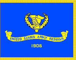 Positional Color, Office of the Chief of the U.S. Army Reserve. The two-star general who heads the Army Reserve (but not the National Guard) displays this flag. The badge, showing the head of a colonial soldier within a wreath, is the insignia of the USAR. The numerals beneath the scroll refer to the ear in which the USAR was founded.