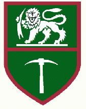 yellow lion and now yellow pickaxe on e green field, with a scroll below