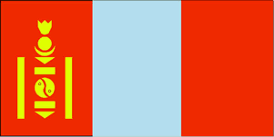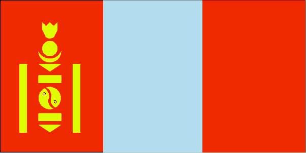on the hoist-side red band in yellow is the national emblem ("soyombo"